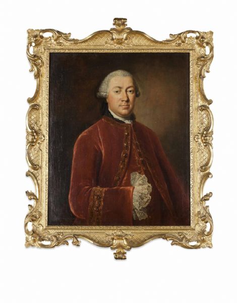 | HALF LENGTH PORTRAIT OF A GENTLEMAN IN A BURGUNDY COAT WITH LACE CUFFS | |