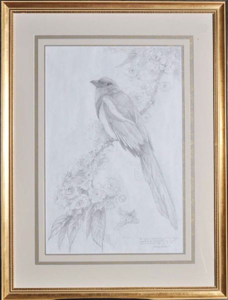 STUDY OF A MAGPIE PERCHED ON A BLOSSOM BRANCH