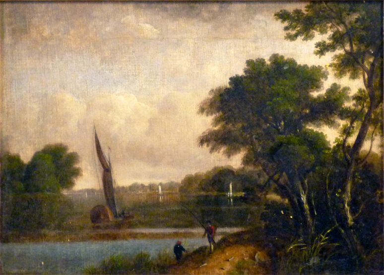 FIGURES FISHING BY A RIVER, WITH A WOODED LANDSCAPE BEYOND