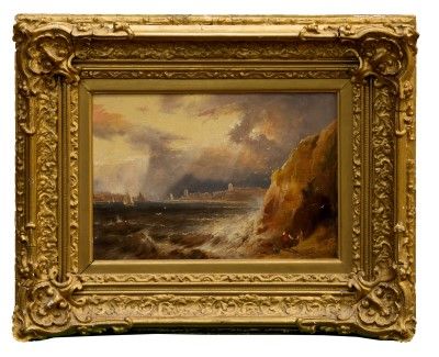 | coastal scene with figures on the foreshore, sailing vessels and town beyond | |