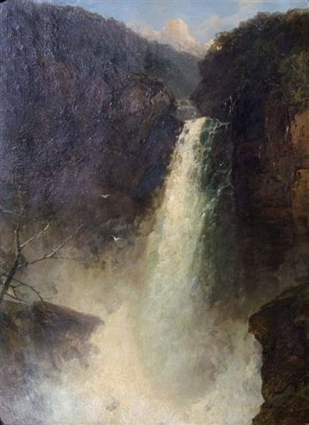 | A waterfall in a wooded river valley with a snow topped mountain in the background | |