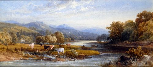 An Extensive Summer River Landscape with Cattle, fishing from a boat