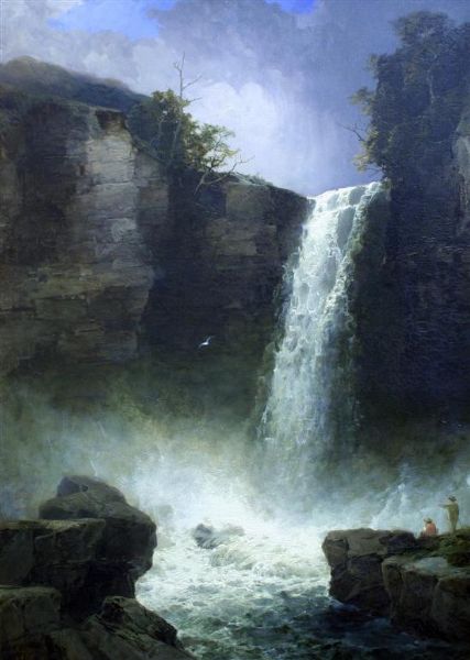 Figures beside a waterfall