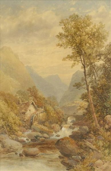 | In North Wales, mountainous landscape with rocky torrent and old water mill | |