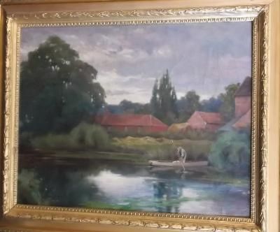 River Landscape, Man in Boat in the Foreground, Farm Buildings Beyond