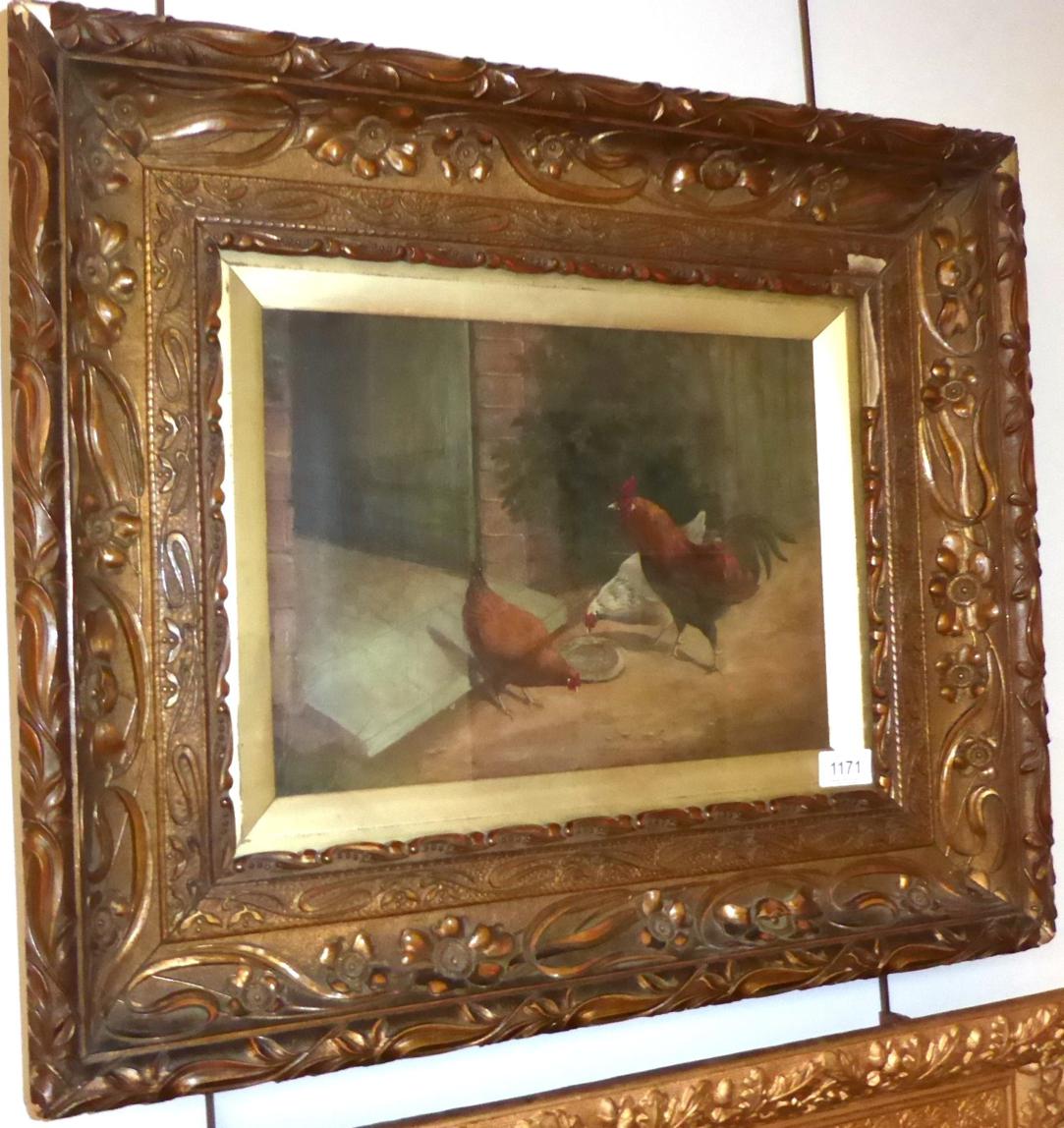 Poultry feeding before a doorway