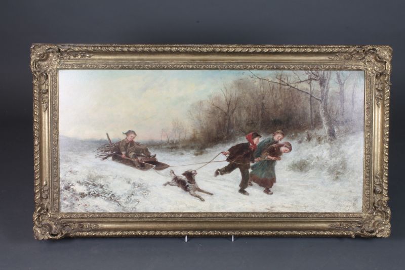 | study of children gathering wood with a sledge with a winter wooded landscape | |