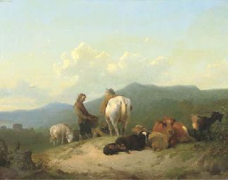 Herdsmen with their cattle on a hilltop