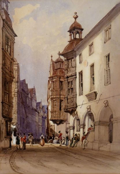 | A STREET SCENE, COBLENZ, WITH SOLDIERS AND OTHER FIGURES | |