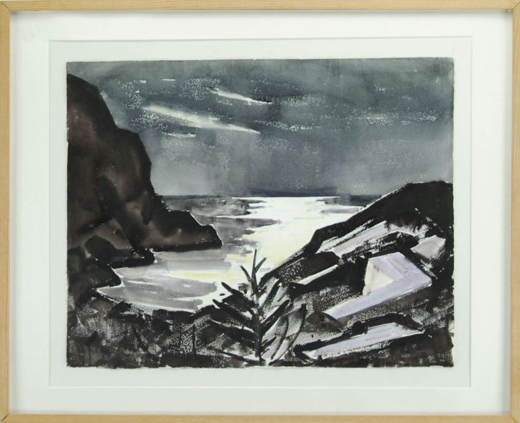 | Watercolor shows a moonlit bay with dark cliff, tree and rooftops. Housed in a natural wood modern frame with white matte | |