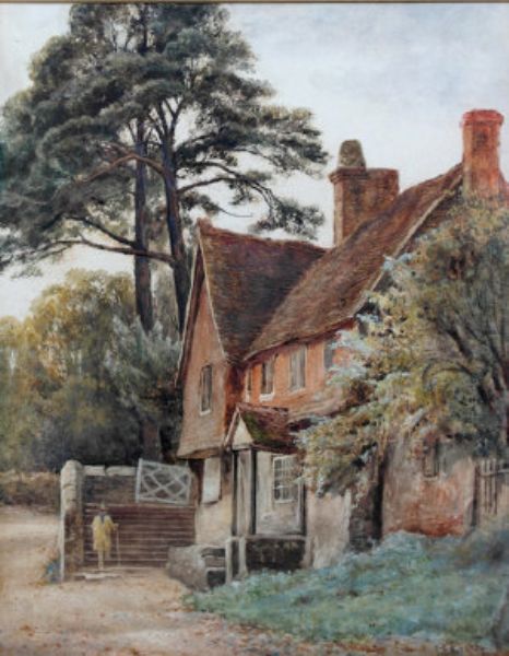 A figure before a house in a landscape