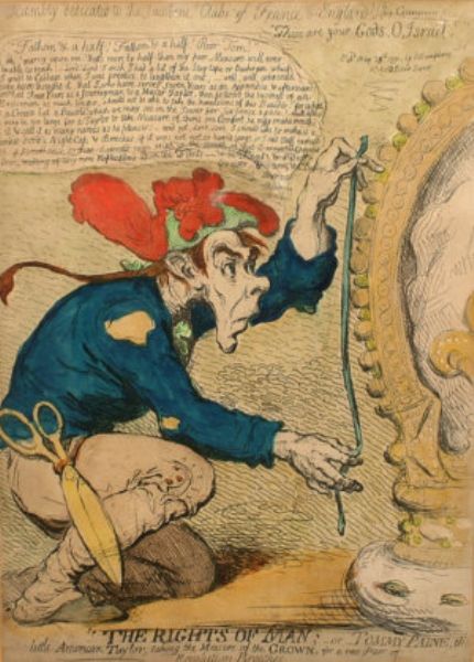| The rights of man; - or - Tommy Paine, the little American taylor, taking the measure of the crown, for a new pair of revolution | |