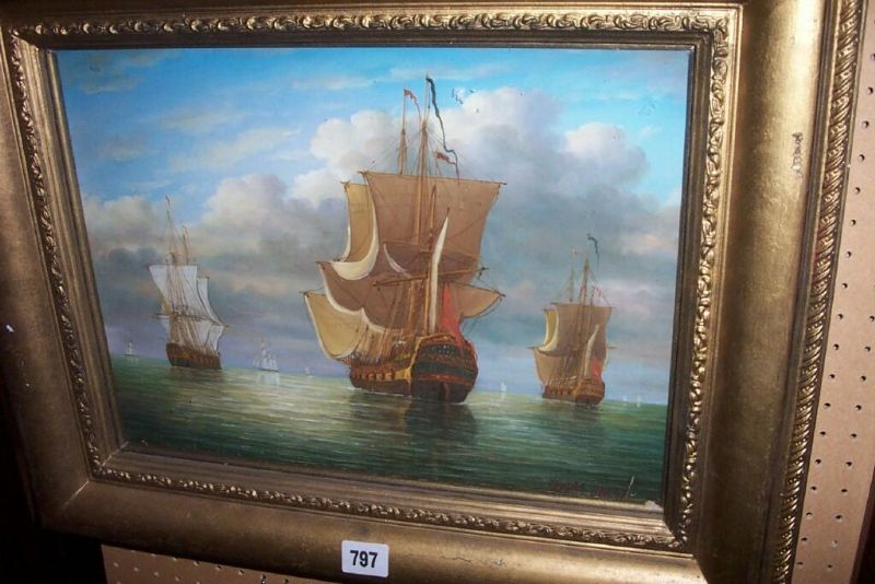 a marine scene with mast battle ships