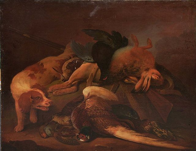 A selection of dead game by a hunting dog
