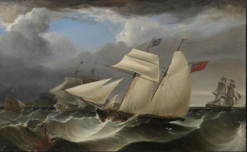 | An armed topsail schooner shortening sail in choppy seas as the pilot cutter approaches on her starboard beam, with a two-decker | |