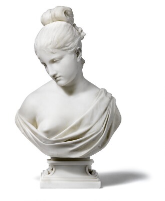 | A portrait bust of a young woman on plinth, white Carrara marble | |