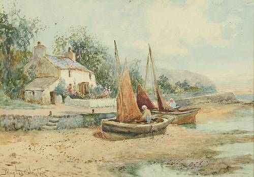 Cottage by the sea with sailing boats and figures, probably Camaes Bay, Anglesey