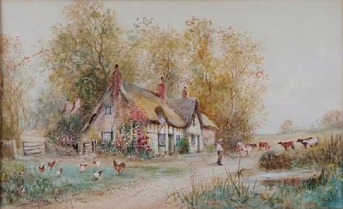 Old Lancashire Cottage; figures, sheep and cattle before a cottage