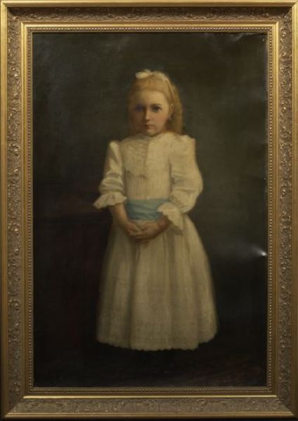 | Full Length Portrait of a Girl in a White Lace Dress with Blue Silk Sash | |