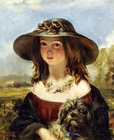 | Half-length portrait of a young girl holding a dog and wearing a wide brimmed hat | |