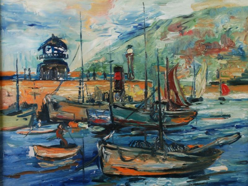 | Harbour scene with quay and moored boats and small boats under sail | |