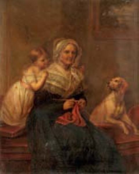 | A lady knitting, a young girl with short red hair and pet hound in an interior | |