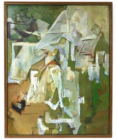 abstract composition depicting layers of jagged white forms on green ground, framed inscribed "Hansen" twice verso, early auction label with artist information verso, expected minor wear, not examined out of frame, ss: 37 1/2" h. x 29 1/2" w. | |