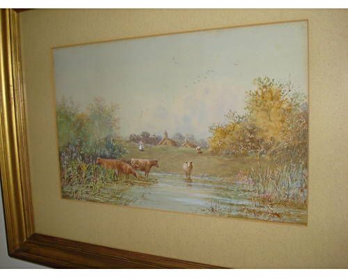 Cattle watering at a pond, a milkmaid and cottage in the distance,