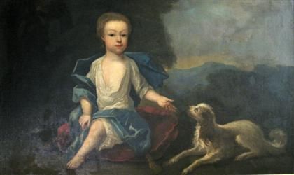 CHILD WITH SPANIEL IN A LANDSCAPE