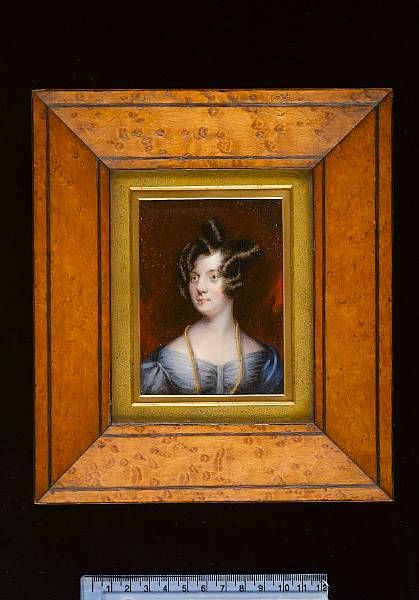 | Miss Sedgwick, wearing pale blue dress, dark blue cloak and gold strand necklace, her hair piled high and in ringlets | |