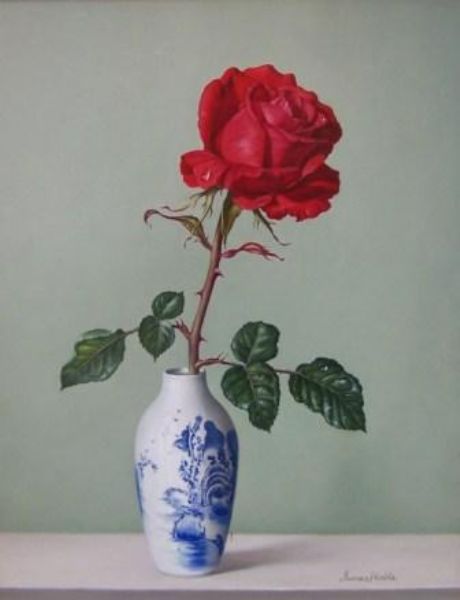 A red rose in a blue and white vase