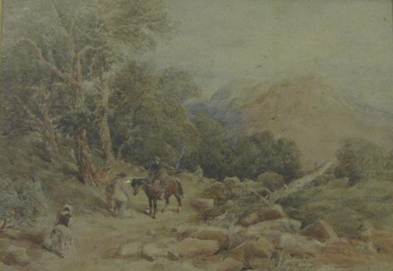 A wooded landscape with travellers on a track