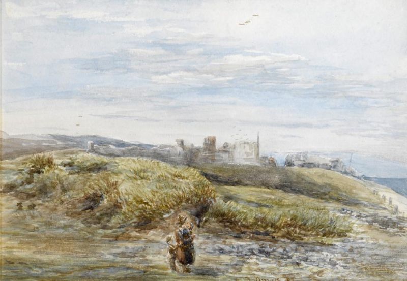 COASTAL LANDSCAPE WITH FIGURES NEAR A CASTLE