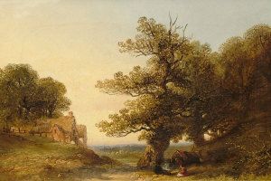 Figures camped beneath an old oak tree with a cottage, woodland and hills in the distance