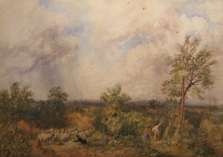 | shepherds resting their sheep in a country lane, picking blackberries from the hedgerow | |
