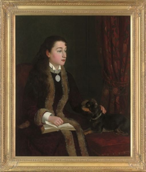 | Portrait of Miss Alice Lister, seated half-length, in a fur lined coat, her right hand resting on an open book, her dog to the s | |