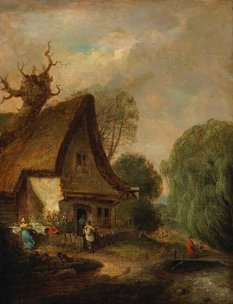 A thatched cottage by a stream