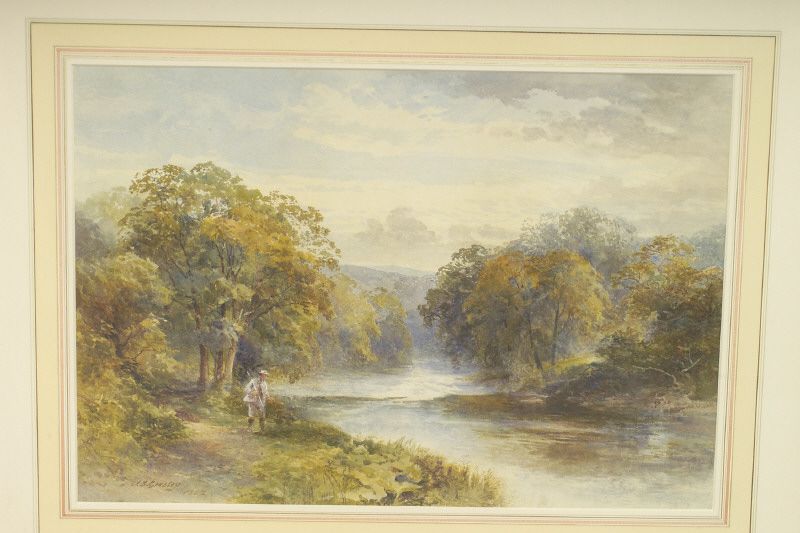 | In North Wales, an Angler Beside a River, Trees and Hills in the Distance | |