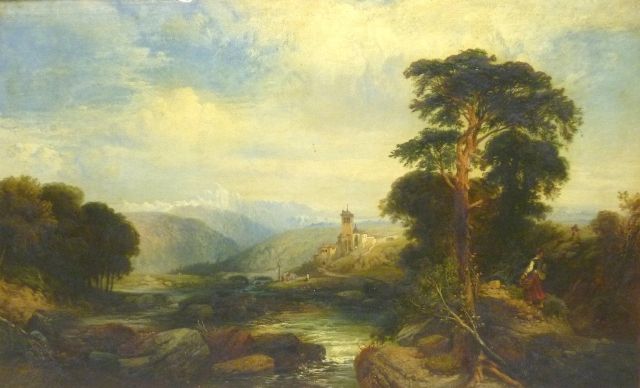 | A Continental river and mountain scene, in the foreground a figure walking, and a man sitting, church and bridge with other dist | |