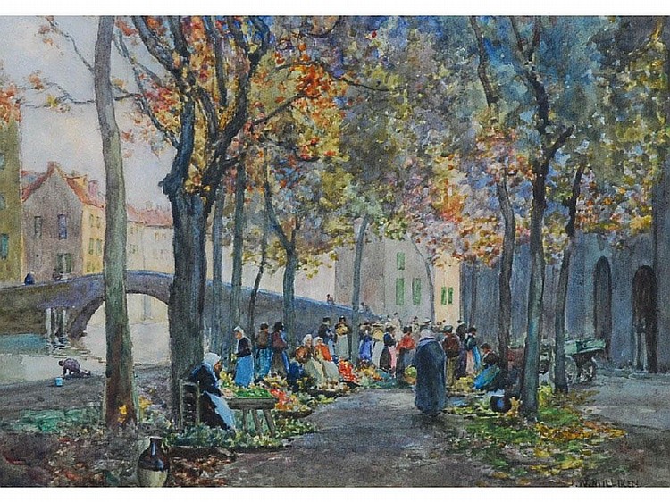 | Continental town scene with river and bridge, numerous figures at a flower market and continental street scene with female figur | |