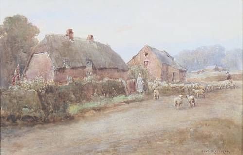 Shepherd and flock before cottages