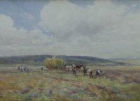 | The hayfield and Lyddairt ,landscape with figures working with horse drawn cart and hill rising beyond | |