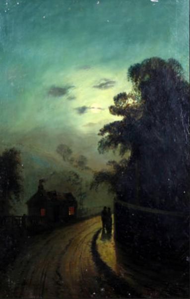 'Lane near Fifield, Oxon', figures on a lane by a cottage at evening