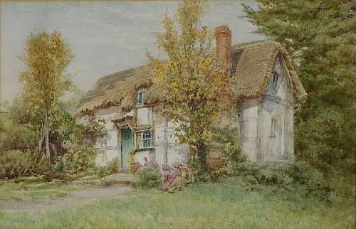 Two figures gardening before a thatched cottage