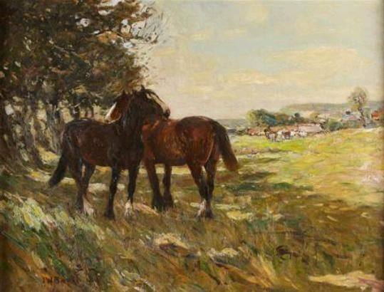 A SUNLIT MEADOW WITH SHIRES AND SHEEP
