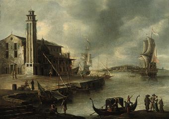| A Mediterranean coastal landscape with elegant figures embarking a boat, dutch men-o'-war and other shipping in a harbour | |