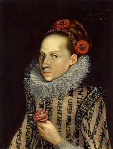 | Porträt der „Maria Salame Aetatis 18“, eines 18-jährigen Mädchens namens Maria Salame, mit Spitzenkragen und einer Rose in der H | |