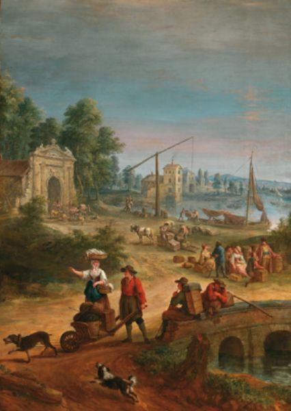 | Wide river landscape with travellers and villagers unloading a ship in the background | |