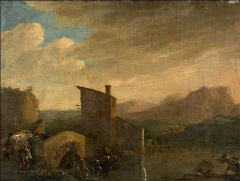 A landscape with a fisherman and drovers with cattle crossing a bridge
