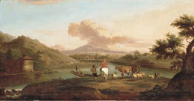 | An extensive Italianate river landscape with herdsmen on a bank and a man fishing by a dwelling | |